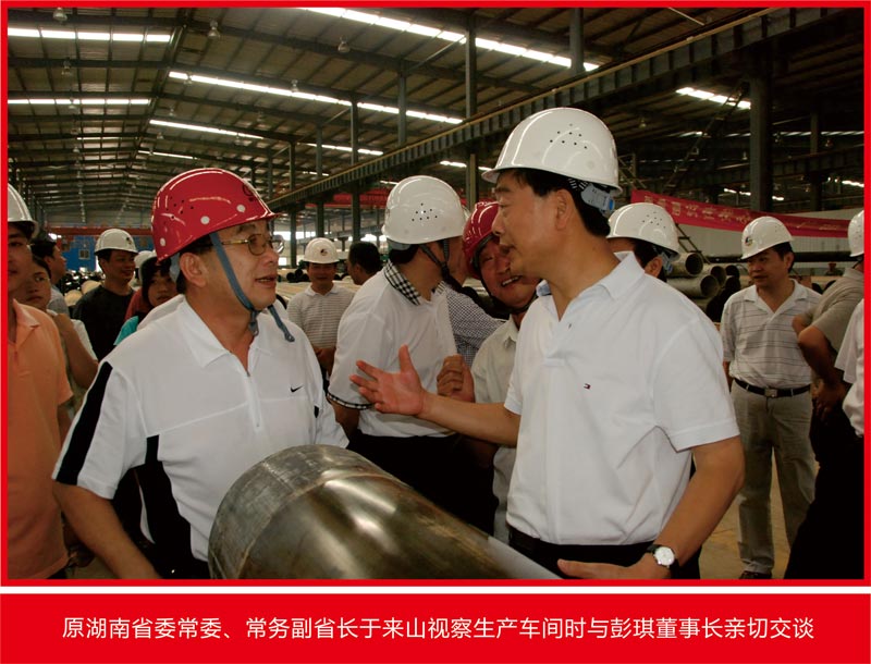 原湖南省省委常委、常務(wù)副省長(zhǎng)于來山視察生產(chǎn)車間時(shí)與彭琪董事長(zhǎng)親切交談